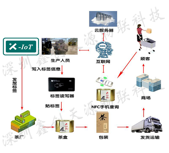 NFC读写器,茶叶厂家客户登陆PC端操作后台,连接NFC读写器,把茶叶的相关信息写入NFC防伪标签; 数据中心,存储产品的各种信息,通过手机端APP查询产品的真伪时,可以读取NFC防伪标签中的产品信息; |